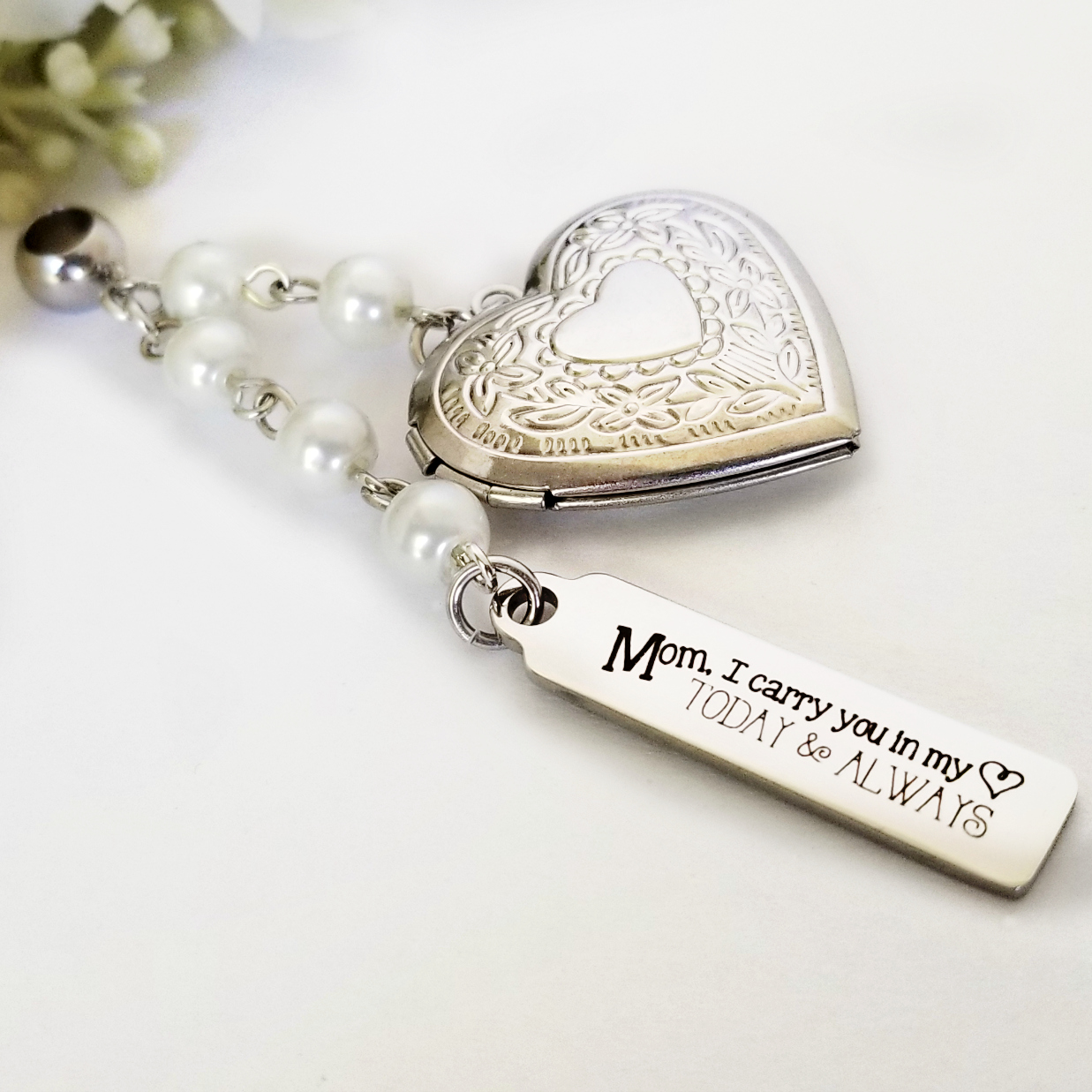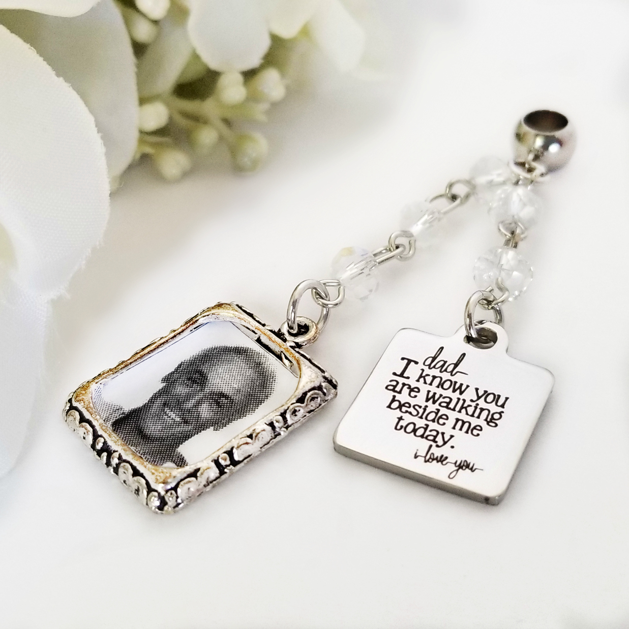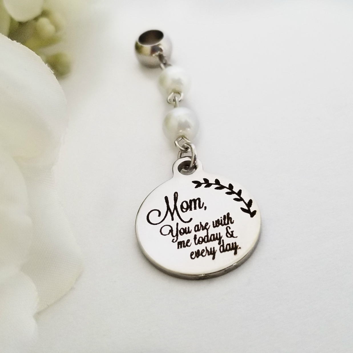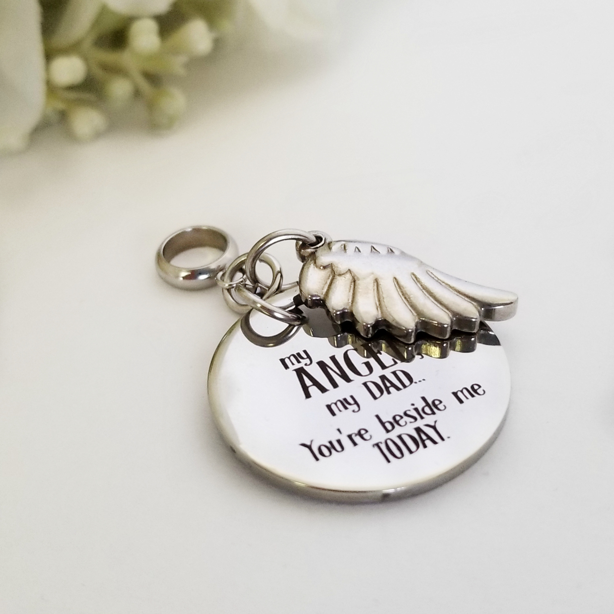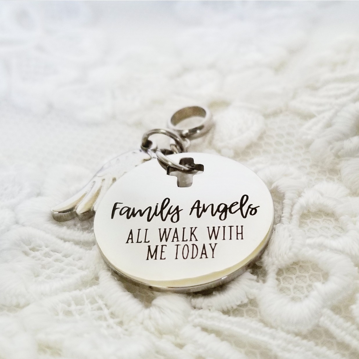 All laser-engraved charms are stainless steel and should be cleaned with a simple soft cloth. Other charms* and findings are stainless steel. Some jump rings aluminum. All materials tarnish-free.