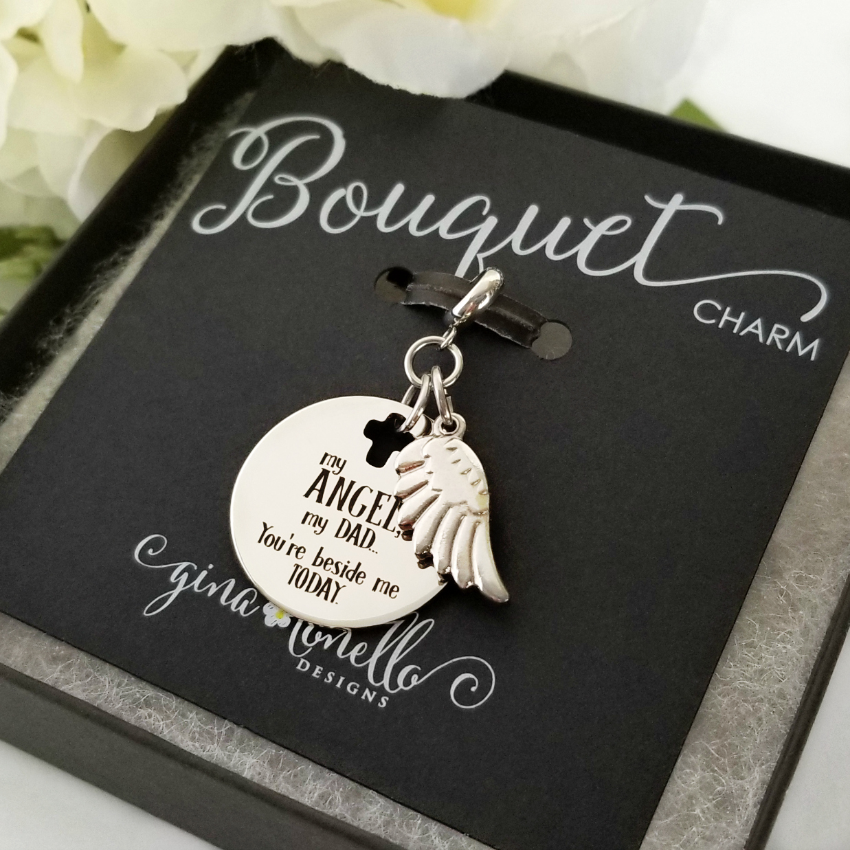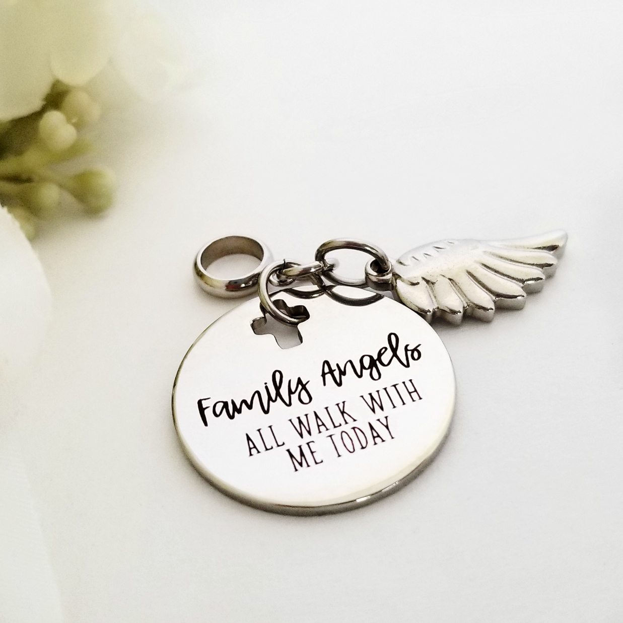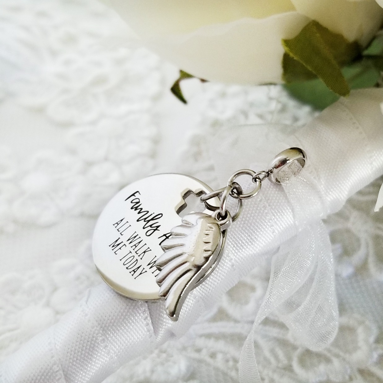 Stainless steel 1″ disc laser engraved, “Family Angels ALL WALK WITH ME TODAY.” Stainless steel 3/4” angel wing hangs next to disc, both from stainless bail used for attaching to bouquet. Wholesale pricing adjusted in bag.